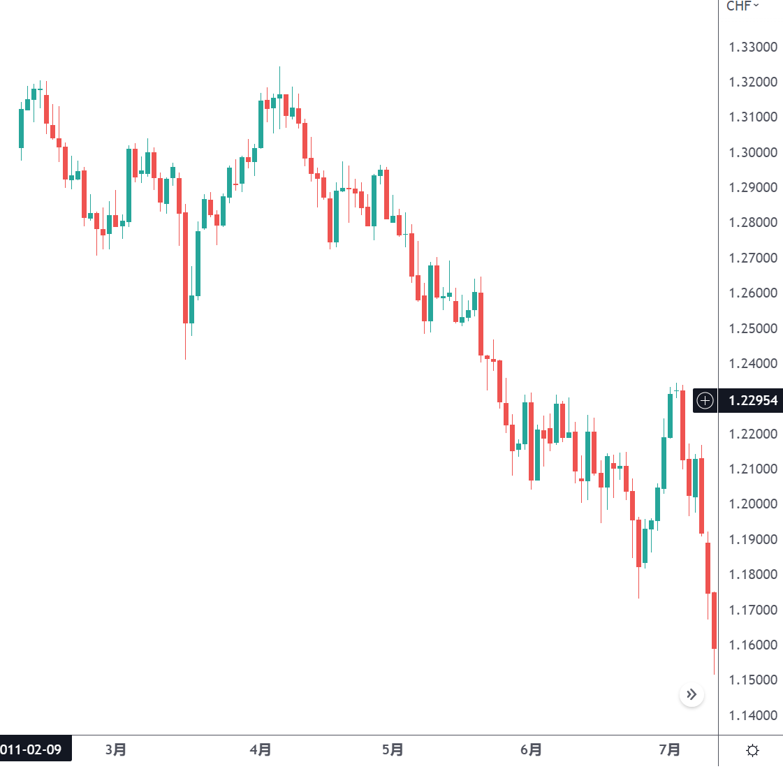 (2011年第二季度,欧元兑瑞郎快速下跌)