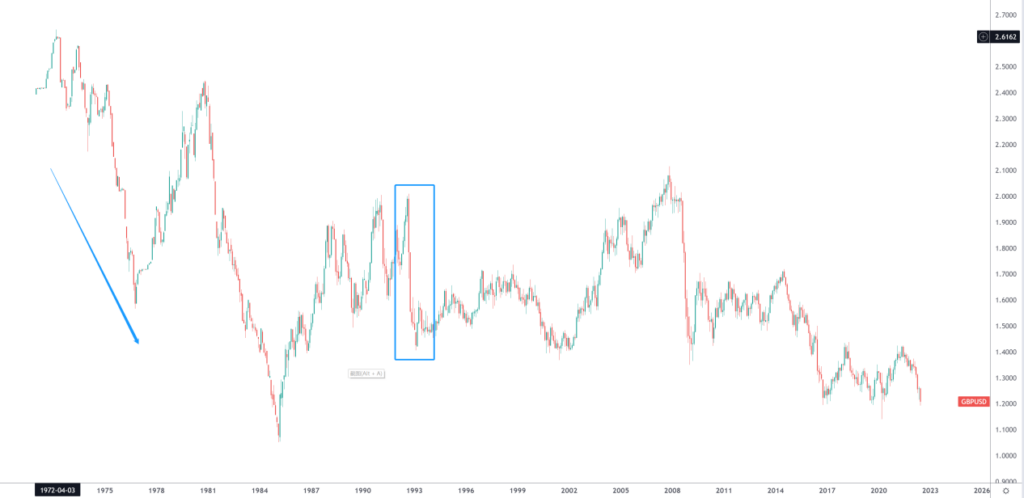 布雷顿森林体系在70年代结束了自己的使命,当美元不在和黄金挂钩宣告着自由浮动汇率时代的来临。这一时期英镑出现了连续下跌之后反弹,再下跌的局面。1990年之后英国曾经短暂的加入欧洲汇率机制,但是两年后英国就被排除出了这个机制。也是在1992年发生了索罗斯狙击英镑的事件,英镑再度暴跌。