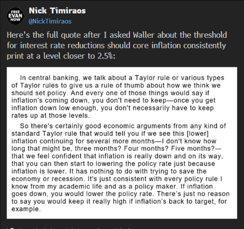 在接受《华尔街日报》记者Nick Timiraos的采访中, Waller提出了我们在三月份就看到降息的可能性。推文中的关键段落是: