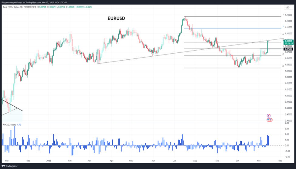 当我们看到美元全面清算时,可以选择贝塔值最高的货币与美元进行交易。MXN、NZD和AUD通常符合这一标准,但我们仍然看到大量的资金流入GBP和EUR。当天,我们看到持有美国5年期国债的收益溢价较德国国债缩小了11个基点,这一利差的收窄是EURUSD升至1.0875的背后支柱。日线图上,我们可以看到EURUSD已经回撤了7月至10月跌势的50%,并且正在测试先前的趋势支撑,而该支撑现在成为阻力位。我期待卖方在1.0900附近介入,但毫无疑问,美元正在推动外汇市场,而且从目前的动态来看,市场似乎越来越愿意在年底前做空美元。