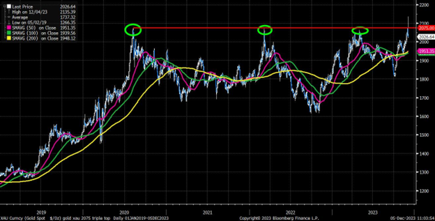 当然,关键问题是黄金接下来的走势。从许多方面来看,周一的涨势遭到拒绝,收盘价又跌破前高点,可能被视为市场自11月初以来一直持续的、受流动性推动的“买入一切”行情可能即将结束的第一个迹象。此外,随着美元再次显示出一些复苏迹象,而美国国债的风险现在似乎更加双面,黄金的牛市情况显得有些摇摆。要解锁进一步的上行空间,重要的是要收复每盎司2075美元的水平,而如果跌破每盎司2000美元的关口,将吸引更多卖家介入。