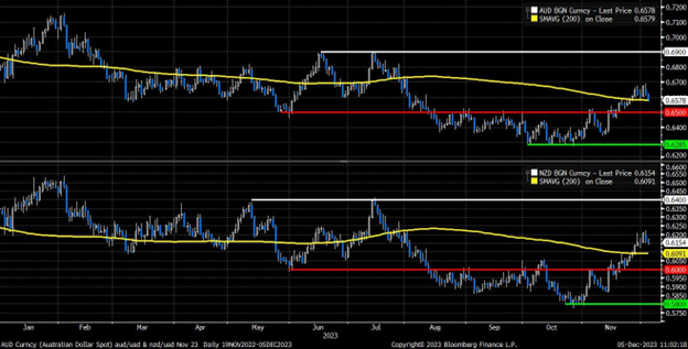 显然,如此显著的宽松条件可能会引发政策制定者的抵制,同时也反对市场对 2024 年降息的激进定价,期货合约暗示明年将实施多达130个基点的宽松政策。这对下周即将召开的 12 月 FOMC 会议的政策制定者提出了一个有趣的挑战,指导方针可能会转向确认紧缩周期现已结束,但委员会成员可能会在“点阵图”方面采取保守态度,以避免进一步的显著宽松,冒使通胀再度卷土重来的风险。对目前市场定价的任何挑战都对美元构成上行风险,对股市构成下行风险。