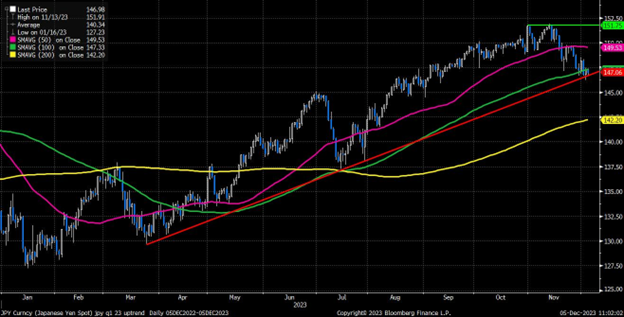 日元(JPY),当然还有黄金,最近在美国国债的强劲反弹中成为最大的受益者之一,因为市场越发相信美联储的紧缩周期已经结束,并且联邦基金利率接下来将会降低。这一反弹使得USD/JPY交易价格比上个月中旬的周期高点低了大约50个基点,那时有很多猜测认为日本财务省通过进行多次“利率检查”进行了干预。