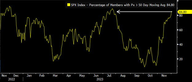 今年以来,市场广度不佳一直是许多人关注的重要问题,众多涨势都被标普500的”七巨头”所主导,它们支撑了整个指数自年初至今令人瞩目的20%的涨幅。然而,最近开始出现一些迹象,表明随着年底的临近,市场广度正在改善。例如,目前超过85%的标普500成分股交易在其的50日移动平均线以上,这是自7月底以来的最高水平。