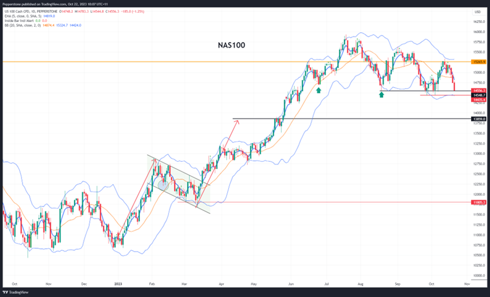 - 美国核心PCE通胀率(10月27日 23:30 AEDT)- 美国广义PCE通胀率预计为4%(从3.5%),核心PCE通胀率为3.7%(从3.9%)- 必须有一个大幅上升的数据才能让12月FOMC会议上调利率成为可能 – 11月的加息不在讨论之列,市场普遍认为维持不变是板上钉钉。