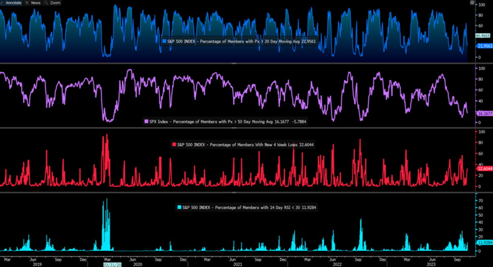 逆向投资者已经开始关注市场情绪,并推出一系列图表,包括不断恶化的市场广度以及指数中低于 20、50 或 200 天移动平均线且 RSI 低于 30 ,或处于 4 周低点的股票。 从目前的情况来看,我们还没有接近最悲观的点。 CNN 的恐惧与贪婪指数可以很好地捕捉整个市场的情绪,也传达了类似的信息。