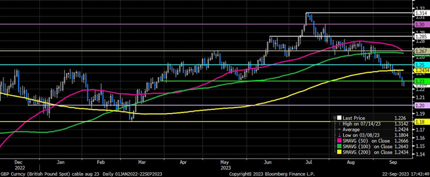特别是在发布了相当糟糕的“快速”九月PMI数据后,欧元区看起来特别脆弱,尤其是在拉加德两周前宣布的25个基点加息可能会变成类似于特里谢政策错误的另一种版本之后。因此,EUR/USD仍然承压,上周已经跌破了1.0650的5月低点,看空者现在有望将价格送向1.05的关口。