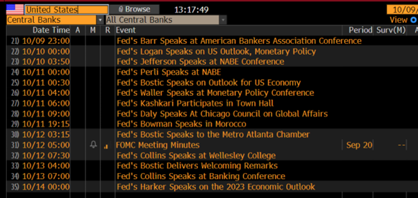 除了美国CPI外,本周将是中央银行的盛宴,美联储、英国央行和欧洲央行官员将在NABE(国家商业经济学家协会)和国际货币基金组织的会议上发表讲话。市场似乎坚信欧洲央行和英国央行的加息周期已经结束,因此美联储官员可能会更积极地影响市场。