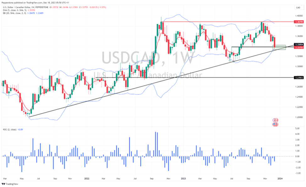 加拿大CPI通胀(12月20日 00:30 AEDT) – 市场预计广义CPI环比降-0.2%,同比涨2.8%(从3.1%),而核心CPI涨幅为3.3%(从3.6%)。市场认为加拿大央行在3月份降息的概率为72%,因此CPI数据可能会影响这一定价。USDCAD关注1.3325的支撑位 – 这是从2021年5月低点开始的上升趋势线。