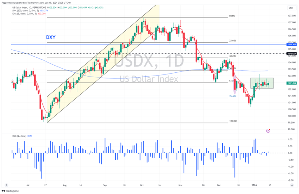 - 中国第四季度GDP(1月17日13:00AEDT) – 经济学家的中值估计预计第四季度GDP环比增长1%,同比增长5.2%(第三季度为4.9%)- GDP本质上是一个回顾性数据点,但鉴于国际资金管理者对投资中国的信心不足,我认为中国GDP报告的结果可能会影响市场波动性。