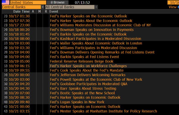 - 美联储主席杰伊·鲍威尔讲话 纽约经济俱乐部(美国东部时间 10 月 20 日 03:00)——本周的亮点。预计鲍威尔将重点关注债券市场走势正在减轻美联储进一步加息的必要性的观点。