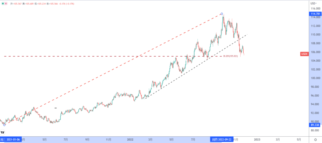 今年已经召开了6次美联储会议,美联储是次次必有加息,并且在最近四次会议上连续加息75个基点。这么快的加息节奏着实助长了美元指数的牛市。但是如今美元指数已经出现了明显的拐头向下迹象,105附近的反弹力度非常疲弱,指数报价似乎呈现要下破创新低的迹象。105的位置关口恰好是2021年美元指数此轮牛市的38.2%回调位置,如果被完整突破,意义十分重大。这背后原因,实际上是市场预期美联储即将在12月份加息时缩小加息幅度,由75个基点缩小至50个基点。这一转变将给美元和其他资产带来重要的变化