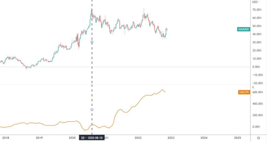 对于黄金而言,理论上既受到通胀影响也受到美联储加息节奏的影响。如果用美国核心CPI同比增速与黄金进行对比,可以发现高通胀其实并不是2020年之后黄金的推动力。