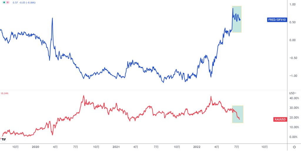 反而随着高通胀加大了美联储加息的节奏步伐,如上图所示的(黄色为美国核心CPI同比变动,蜡烛图为黄金走势),黄金呈现不断下跌的走势。因此未来通胀预期的减弱反而可能对黄金起到助推作用。有没有什么指标,既能体现未来利率预期,又能体现通胀预期的变动呢?美国十年期真实国债收益率由10年期国债收益率减去10年期通胀预期而来,可以很好的覆盖通胀和利率预期变化。使用剔除通胀的10年期美国真实国债收益率走势和黄金走势对比发现,二者呈现高度负相关关系。2018年11月之后,这一指标(蓝色)不断下降至2020年8月。这一段时间中下方红色表示的黄金呈现了创新高的一轮牛市。当10年期美国真实国债收益率呈现双底后反弹上升,黄金也对应开始下降。因此可以把这一既反映通胀预期又反应利率预期的指标作为观察黄金的核心武器。