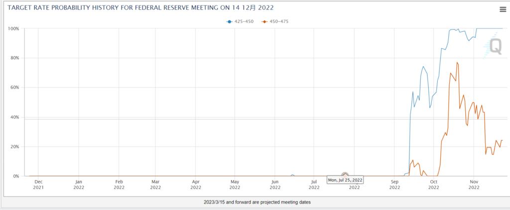 长方形阴影区域当中,10年期美国真实国债收益率已经从0.91回落至0.58附近,而黄金则涨幅稍弱,预示后期能量充沛。这表明市场针对未来美国针对通胀的利率曲线预期才是主导黄金发展的力量。如今预期有没有下跌呢?从CME交易所基于美国国债期货得出的美联储预期观察器来看,12月加息50的基点的概率从11月初的48%左右上升至75%,而加息75个基点的概率已经下降至24%。