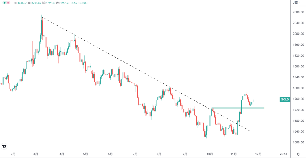 在走势图当中,黄金现货在11月份突破了下跌趋势线,并且随后出现频繁的大阳柱上涨,暗示动能充足。而现在黄金也站稳了1723附近的支撑阻力互换位置。结合上文所述的基本面逻辑关系,在美联储加息步伐放缓的预期愈演愈烈下,黄金的未来或许会再放光芒。