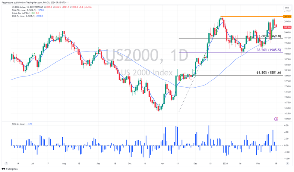当美国大盘指数关注英伟达的财报(周三盘后)时,有人开始思考如果我们看到NAS100和US500指数出现下行和波动,是否会有一部分资金流入美国小盘股 – US2000指数在这里是一个很好的代理。从US2000指数的行业构成来看,我们看到18.7%的指数权重偏向于工业股,而15.2%偏向于金融股,这表明对美国10年期国债的敏感性较高。因此,美国10年期国债的上涨将有助于指数的上行。交易者还可以通过超微电脑(权重为0.52%)获得人工智能主题的杠杆机会,近来该股的波动性非常大。鉴于MicroStrategy的市值为118.7亿美元,它的权重排名第二,因此指数也存在高贝塔驱动的因素。在较高时间框架上的设置还需要进一步完善,但已经引起关注- 自10月至12月强劲上涨了27%之后,价格回撤至38.2%斐波纳契水平,形成了一个底部,并重新测试2073的高点。设定警报以捕捉多头突破,如果收盘价超过此水平,将为持续上涨打下坚实的基础。