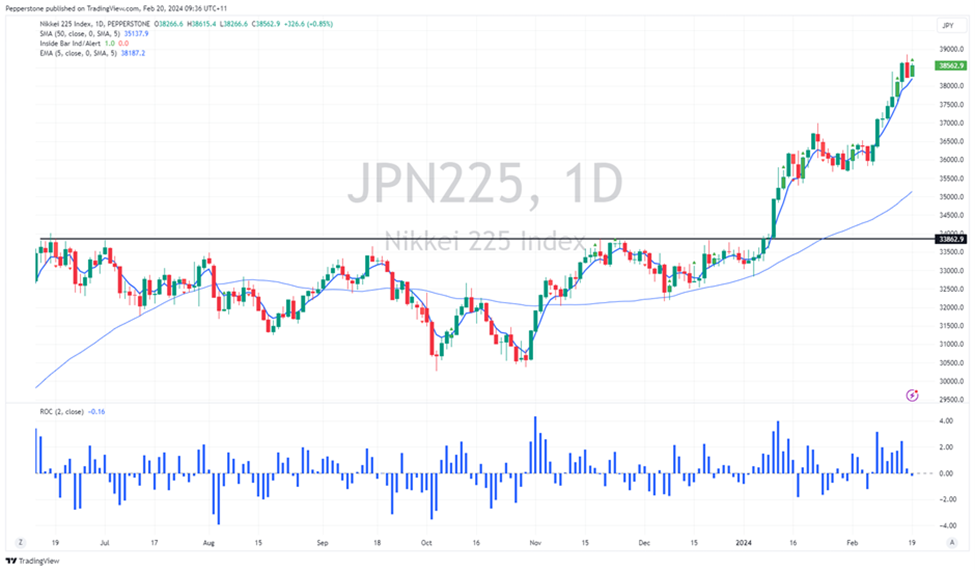 日本股市距离1989年12月29日创下的历史最高点仅有1.2%,已经过去了409个月。当然,与1989年底相比,日本股市的构成已经发生了根本性的变化,但毫无疑问,一旦JPN225现货指数突破38,957(历史最高点),将引起媒体和我们的股指交易员的关注。虽然我们可以指出其他股票市场处于或接近历史最高水平,但JPN225指数在2024年表现最强劲(年初至今涨幅15%),即使以美元计价,今年以来的回报率也远远超过其他所有发达市场。如果突破历史最高点,我们很快就会看到新的高点出现,目标将转向40,000点。买强势,卖弱势。