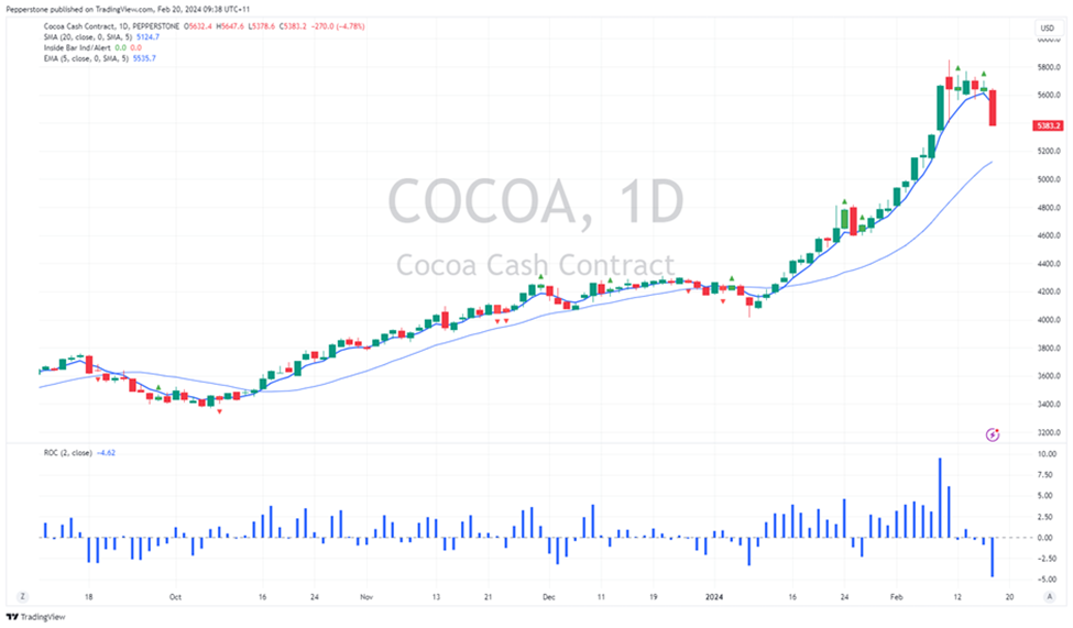 软商品/农产品相比黄金、股票指数和外汇等传统交易工具可能显得更加特殊,但对于那些擅长跟踪趋势和动量的交易者来说,软商品/农产品可能是捕捉分布中的离群值的最佳工具之一 – 当它们启动时,行情可能持续一段时间,交易者可以在市场允许的情况下持有头寸并进行追踪止损。目前,小麦、玉米、豆粕、大豆、棉花和牛肉等商品都出现了强劲的单边走势,尽管趋势已经成熟。可可从1月份到2月19日的高点上涨了45%,但趋势正在逆转,可能会进一步回归至20日均线附近。