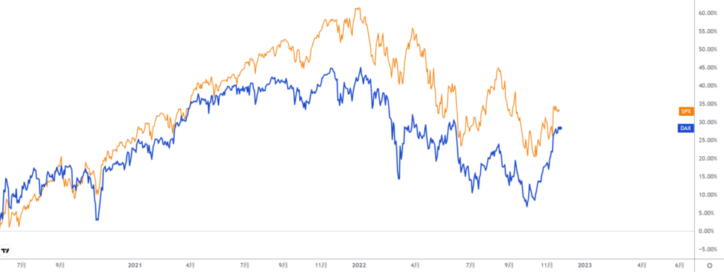 俄乌战争、全球通胀担忧、英国脱欧和新馆疫情等事件都曾对 DAX 的价格产生了连锁反应。近期欧央行不断加息叠加能源供应也使得DAX40的估值水平被扼杀。但是与此同时,全球股指的同向性也不应该被忽视,有时往往超越国内因素成为主导股指走势的因子。随着美联储放缓加息步伐板上钉钉,下图中蓝色的DAX40指数也追随橙色美国标普500指数开启了一轮明显的反弹。