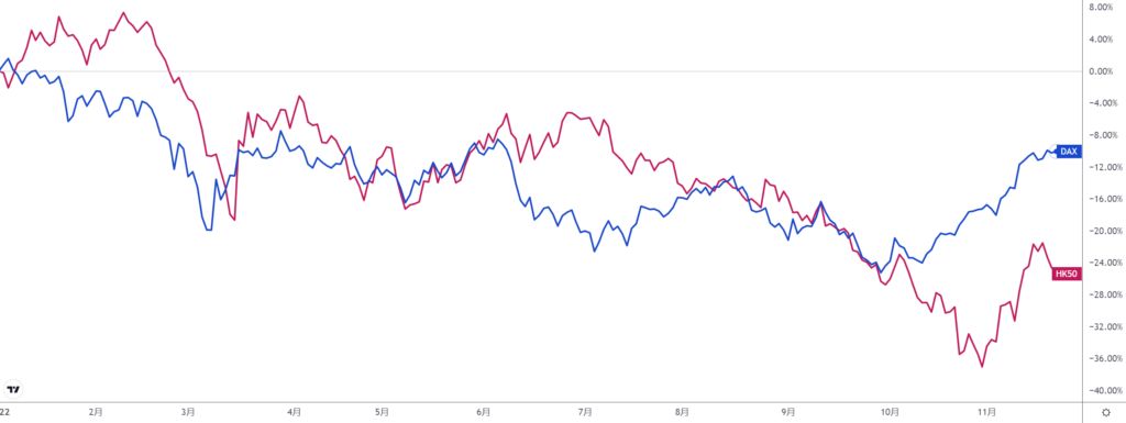 (恒生指数-红色;DAX40指数-蓝色)