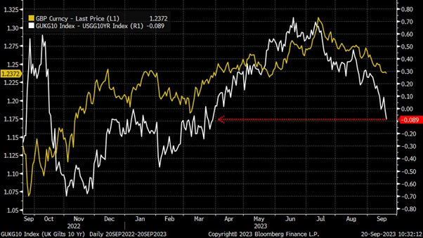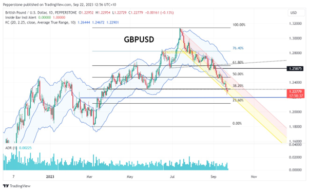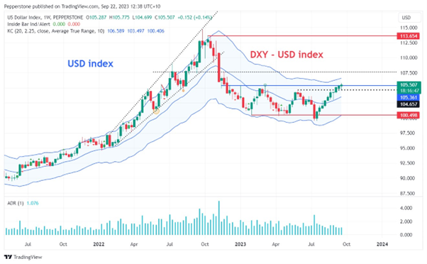 美联储暂停加息的举措并没有打击美元的强劲势头,加之市场波动性的增加,本周美指连续第10周走高,上破在去年10月、12月以及今年3月曾被多次测试的105.36阻力位,目前在105.5附近交投。今年11月,美联储仍然存在一次加息可能。受到强劲的劳动力市场和高能源价格的支持,美国利率也有望在一段时间内保持较高水平。随着 “软着陆” 叙事逐渐引起人们的信任,明年大幅降息的可能性逐渐减少,或将导致美国国债收益率上升。这些因素都在年底前支撑美指表现,如果美指继续上行,价格可能会在107.63附近受到压力。