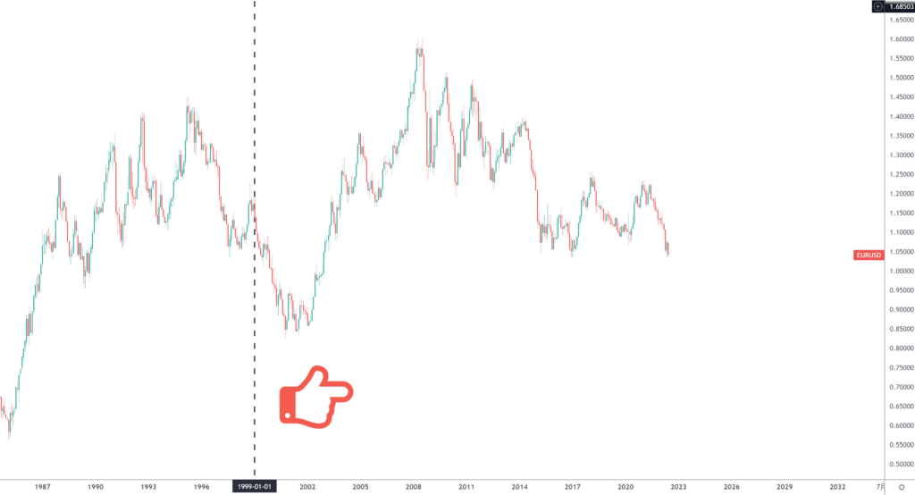 (EUR/USD历史走势图,虚线为欧元诞生日)