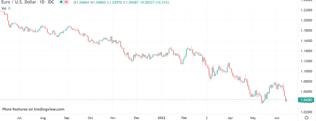 进入2022年,EUR/USD一直保持单边下跌的态势,接连跌破多个关口,在6月14日来到1.04387附近。这意味着再下跌438点,欧元和美元就会到达平价,1欧元的价值和一美元相当。如果跌破1,欧元则比美元更便宜,这将是20年来前所未有的局面。
