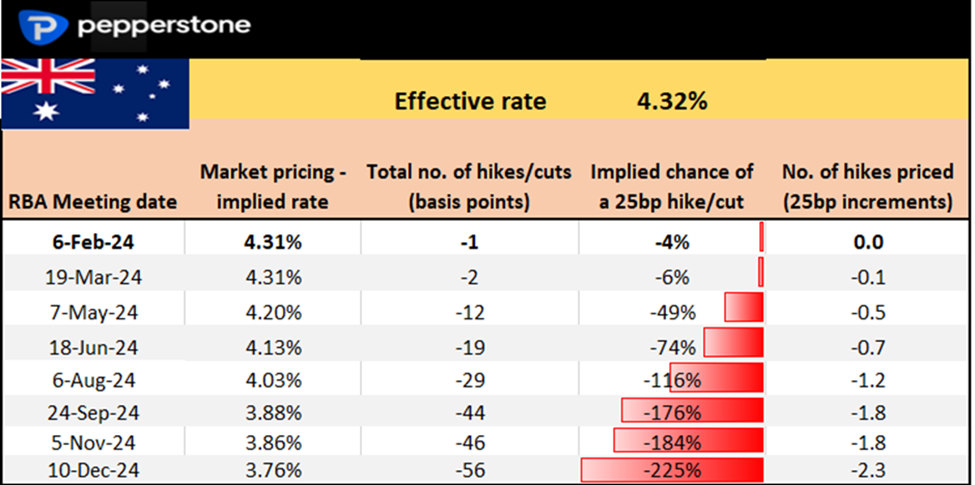 由于核心和广义CPI都明显低于11月货币政策报告的预测,我们质疑他们对2024年6月和12月CPI的预测是否会进行调整,目前这两者分别为4%和3.5%。因此对这些估计的任何修正都可能会导致利率期货和由此延伸的澳元和AUS200指数产生一些显著波动。