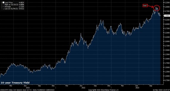 在市场展望12月联邦公开市场委员会 (FOMC) 会议之际,这确实给政策制定者带来了相当棘手的沟通问题。该声明可能会进行调整,以反映不可避免的情况,即进一步加息已不再可能,尽管委员会需要在这样做的同时,还会再次试图向人们灌输“更高的价格,更长的时间”的信息。因此,“点阵图”不太可能将 2024 年的降息幅度超过目前预计的 50 个基点。