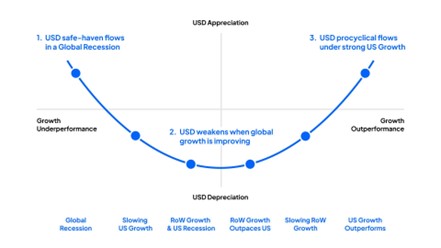 因此,随着政策差异看起来不再对美元有利,且经济增长继续放缓,我们似乎正在走向一种市场处于“美元微笑”中间的环境,在这个阶段,美元往往会陷入困境。随着政策和增长分歧缩小,有利于世界其他地区,并且避险需求消散,其与发达市场同行的差距也在缩小。