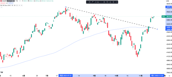 这样的环境对于股票等风险较高的资产来说应该是有利的。标准普尔500指数表现积极,巩固了近期突破 4,500 点的涨幅,并且以明显跳空的方式突破了下降趋势线。情况似乎为年底的反弹做好了准备。