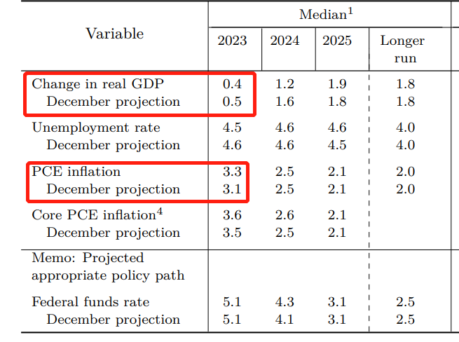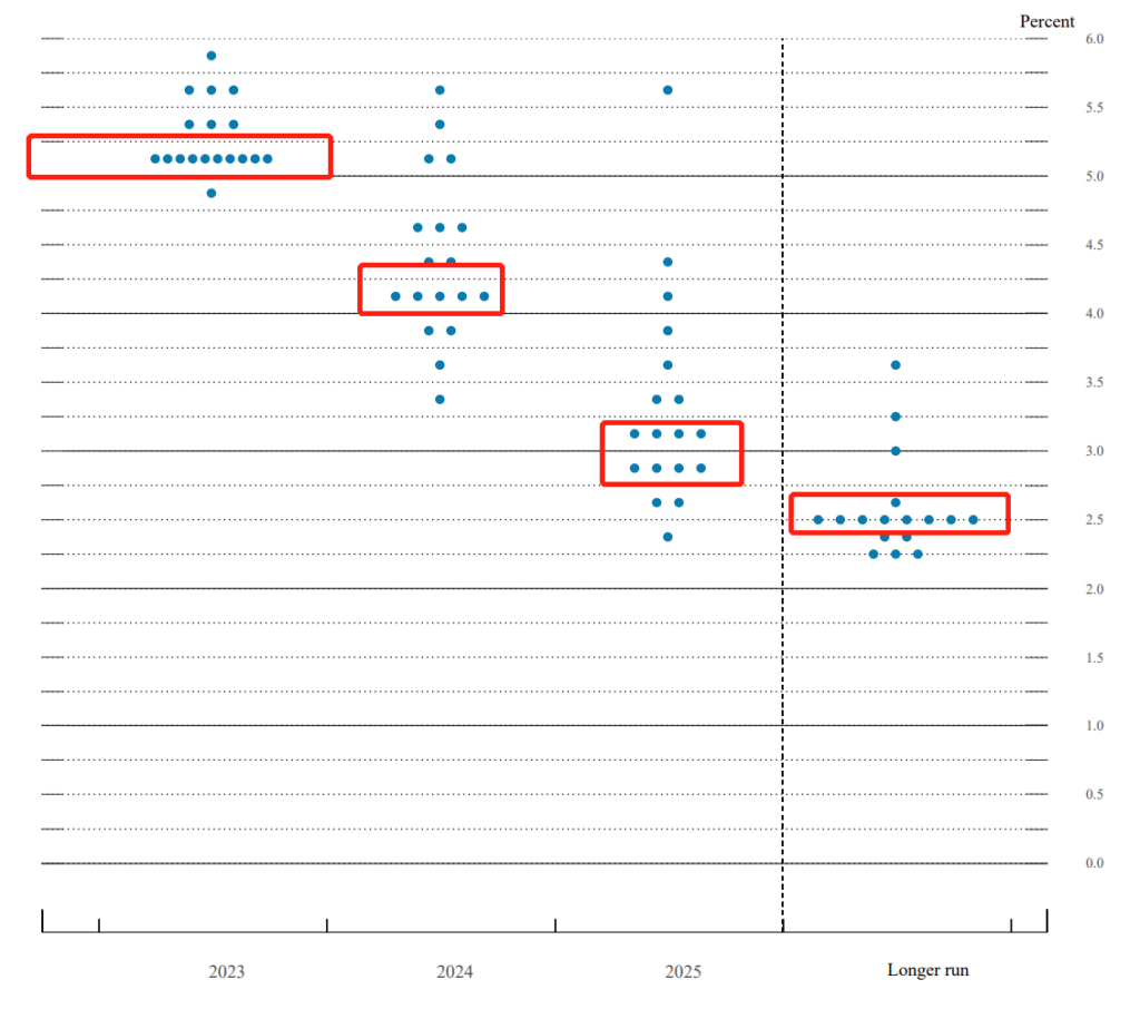 作为季度会议,点阵图和经济预测数据的调整也是看点。从会后发布的材料来看,2023年美国GDP增速下调至0.4%,核心PCE通胀数据上调至3.6%。在新闻发布会上,鲍威尔也坦白承认较高的利率和较慢的经济增长正在对美国企业产生拖累效果。对于未来的加息空间上,2023年最新的点阵图预期在5.0%-5.25%之间。也就是这次加息结束之后,预期还有一次加息25个基点。值得注意的是2024-2025年的利率中枢预测,相较于2023年明显降低,说明明年降息概率大于加息概率。
