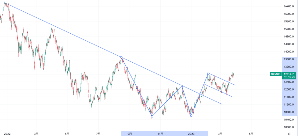 在美国股指当中,理应受伤最深的科技股指数NAS100在最近却反弹的厉害,这或许是受到了加息预期大幅降低以及利空出尽变利好的影响。四小时图中,若忽略引线的存在,可以发现一个W底形态,2月至今的走势图形成调整旗型结构并向上突破。因此,可以留意12814关口能否被强烈突破