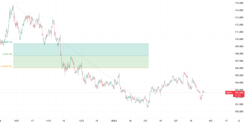 从走势图上看,自2月至硅谷银行危机之前,美元指数由于加息50个基点的概率上升而走强。硅谷银行危机之后,随着加息减弱为25个基点预期占据上风而下降。从目前美联储预期来看,若没有爆发大规模流动性危机情况下,美元指数风险偏向下行。2月至3月的反弹中,美元指数没有触及下跌行情的38.2%斐波那契回撤位置,说明反弹力度弱,技术层面上延续下行概率较大。