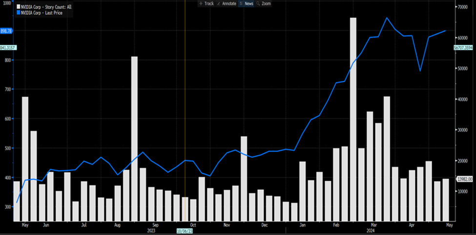 自三月以来,炒作已经平息,我们看到新闻报道减少。事实上,我们看到越来越多的文章将交易者引导远离英伟达,转向人工智能半导体领域的其他较小公司,这些公司可能会出现爆炸性的走势。