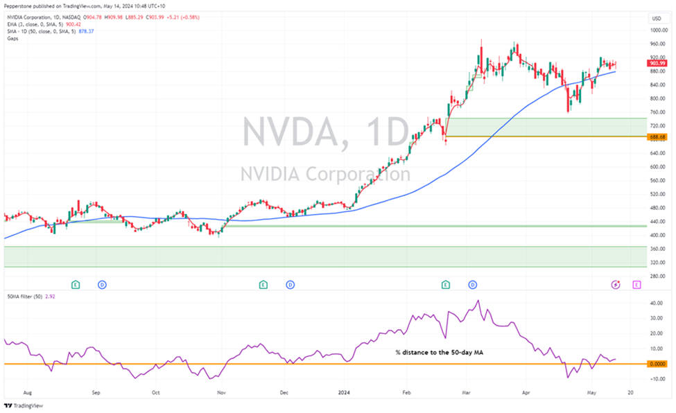 我们还可以从英伟达的技术设置和价格走势中看到这种动能不足。股价在$947到$756之间上涨了$205,目前发现公允价值约为$900。交易者仍然在买入回调,多头建仓的触发点似乎是股价跌至50日移动平均线以下10%。