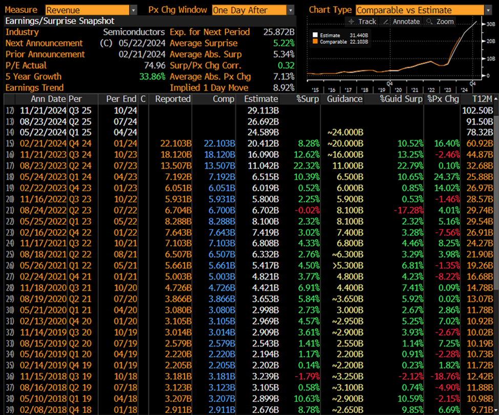 让我们不要忘记,在全球范围内,很少有公司能像英伟达一样在击败分析师对每股收益(EPS)、营收或毛利润的共识预期方面表现出色。也许门槛一直被设定得太低,但自2018年以来,除了Q3 2019和Q2 2023这两次之外,英伟达几乎在每一个报告季度都超过了对当季营收和下一季度表现的预期。
