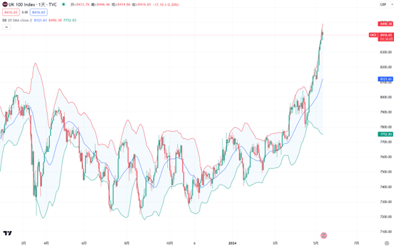 当货币政策呈现鸽派的时候,股市倾向于上涨。 英国富时100指数突破8200点,创出历史新高。这种情况下,考虑到市场“惯性”,向上成了阻力最小的一种选择。在Tradingview选择Pepperstone的富时指数代码UK100后,添加布林带指标。可以看出该指数贴着上轨攀升,可以留意回落到中轨之后的布局机会。