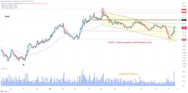 技术面已经转为看涨,带来了进一步的上行风险——金价突破了自 5 月份以来一直保持的熊市通道,黄金多头(当然对于波段交易者来说)自然会希望这种情况得以建立。由于价格(日线)仍保持在 5 日均线上方,动能表明我们存在推向 9 月高点 1947/52 美元的风险,回调应会受到支持。如果彻底突破 1952 美元,那么 1981 美元就会发挥作用,该水平自 5 月份以来一直是一个很大的阻力位 – 我们已经看到供应增加,并至少有九次限制了上涨空间。