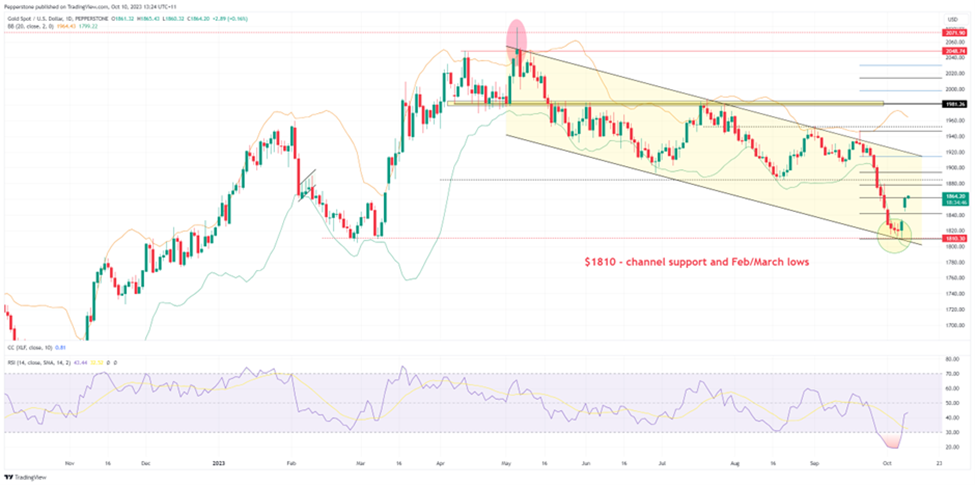 黄金多头之所以被激励,是因为市场逐渐相信美联储已经结束了加息周期。简单来说,10年期美债实际和名义利率都大幅上涨,加上美元贸易加权指数上涨了7%,相当于额外的一次升息。