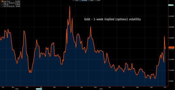 波动性、范围扩大/缩小以及价格是趋势还是震荡的变化,可能会对我们的分析策略产生巨大影响。可以使用期权市场的隐含波动率来看预期未来是平静的行情还是腥风血雨。在2023年10月份之后,黄金的隐含波动率开始飙升,预示着不同以往的行情就要开展了。