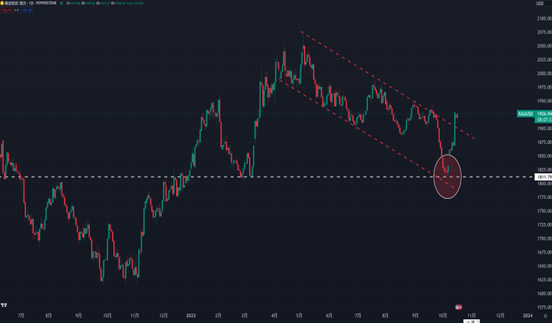 以简单的趋势线 支撑阻力 通道来进行分析,10月初的低位1810美金恰好是之前的支撑阻力互换位置,10月9日的开盘跳空上涨印证了强力支撑的有效性.目前经过10月13日的大涨之后,黄金已经突破了 5 月份以来一直保持的熊市通道.经过周一和周二的盘整,没有明显的价格下跌回撤,暗示动能较为充足.这种情况下应该会推向 9 月高点 1947/52 美元,经过短暂盘整后仍有冲击1980美元的动力.