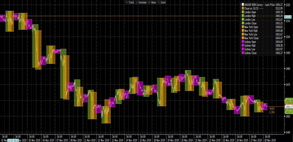 国际市场上,每天三个交易时段(亚洲、欧洲和美国)。在下图中,我们将各个时段标记为阴影区域(紫色-亚洲,绿色-欧洲,橙色-美国),代表该时段交易区间的高点到低点。使用此样本可以清楚地看出,黄金在整个亚洲一直处于震荡区间,因此这可能不适合其策略在较高波动性中最有效的交易者。欧洲和美国时间段内黄金非常活跃,因为大多数有影响力的一级数据发布或有影响力的央行行长在此期间发表讲话。