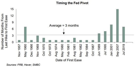 下图是网上关于美联储最后一次加息到降息开始的间隔时间。如果从1970年开始计算的话,一旦利率达到顶峰,美联储平均只会将利率维持在该水平 5.5 个月,然后就会再次降低利率。如果考虑1957年以来数据的话平均水平是三个月。