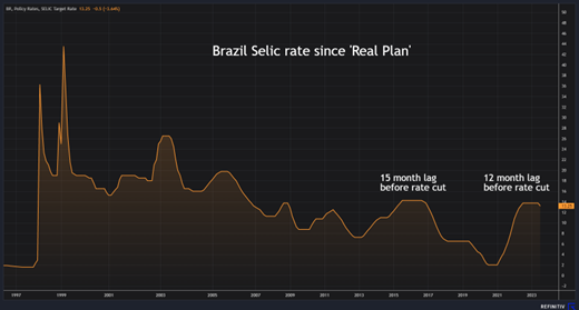 与此同时,全球宽松政策似乎正在试探性地进行。巴西央行是 2021 年初率先加息的央行之一,在暂停12个月后开始降息。