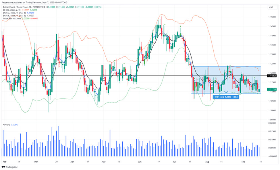 瑞士国家银行(SNB)会议(周四 17:30 AEST) – 瑞士国家银行应该会提高25个基点至2%,市场认为这一结果发生的概率为68%。CADCHF最近一直在大幅上涨,所以我会在25个基点的加息后寻找任何回调的机会来开仓多单。GBPCHF正测试最近的区间低点1.1085,因此可能会出现技术性反弹,尽管考虑到这两种货币存在的事件风险,出现稳定的区间突破也不足为奇。