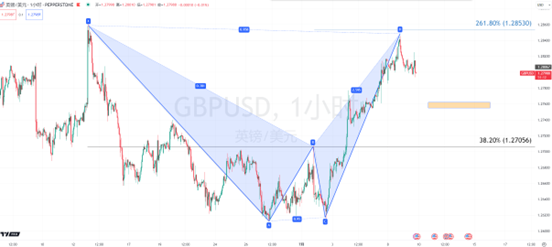 英镑兑美元受到广泛关注,目前似乎出现了利好出尽变利空的情况。从形态角度上看,这里形成了谐波形态当中的看跌蝙蝠,后期大概率朝着1.2760附近运动。