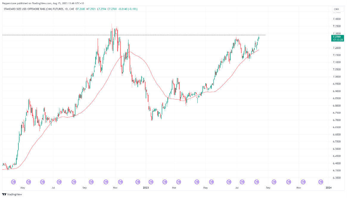 图3. 离岸人民币汇率降至2022年11月以来最低,数据来源:TradingView