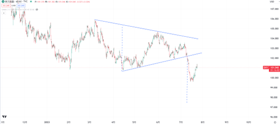 美元指数盘面上呈现对上周大跌的回调整理态势。从形态角度分析可能出现跌破对称三角形后的整理回踩情景。